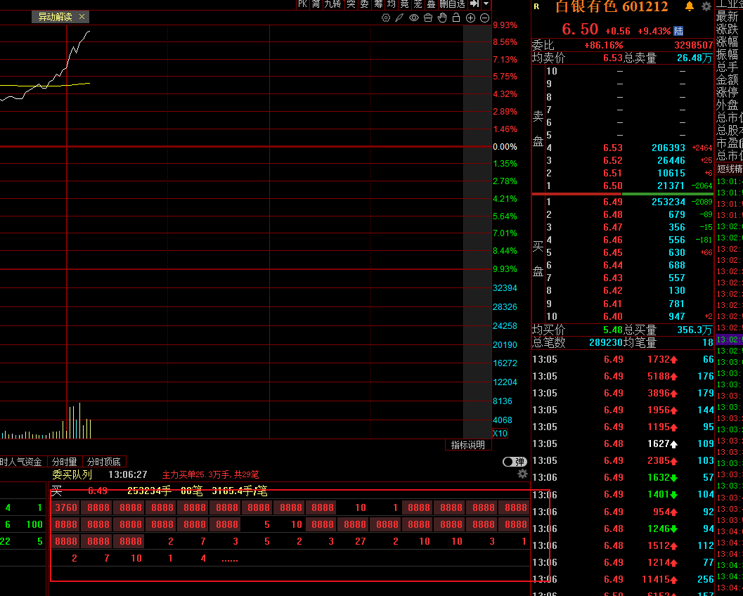 金开大道大买白银有色,我今天下午看到他8888手连排,我就知道这么大手笔的游资,要么是章盟主要么是金开大道,这两个游资出手封板基本上没有封不住的。白银有色主要炒的还是黄金,最近黄金涨黄金股不涨。只能去炒黄金的妖股。游资炒他的逻辑就是技术面好,比其他的黄金股有辨识度。唯一不好的是名字中是白银,如果带上黄金会更强。