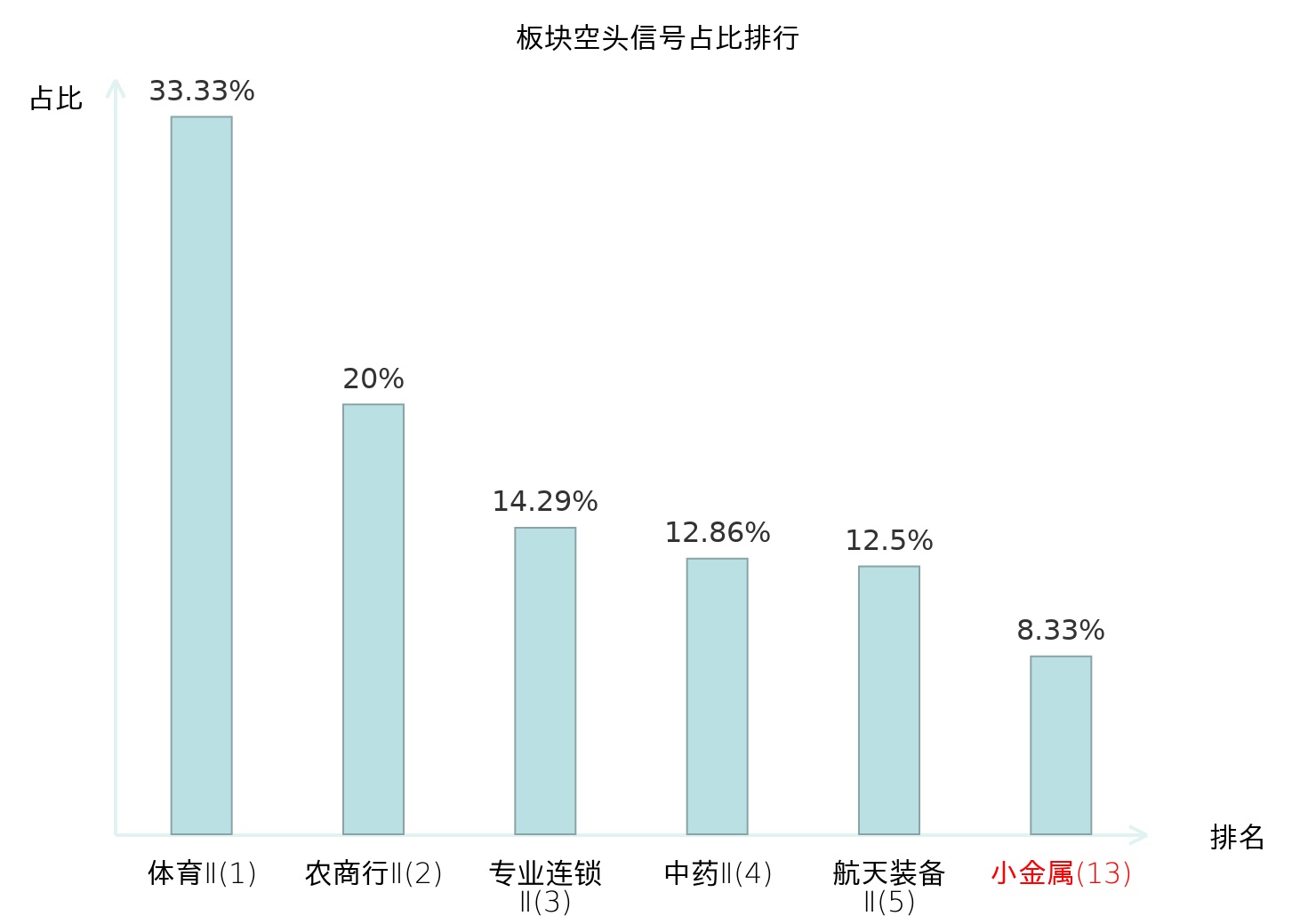 全市场所有行业板块中主力空头信号占比排名中,体育Ⅱ板块位居第一。医药商业板块名次提升最快,较昨日上升107位。
