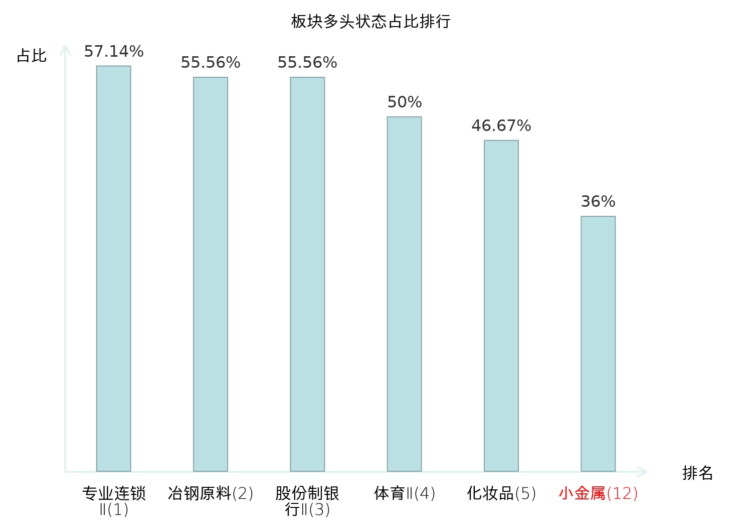 全市场所有行业板块中主力多头状态占比排名中,专业连锁Ⅱ板块位居第一。乘用车板块名次提升最快,较昨日上升85位。