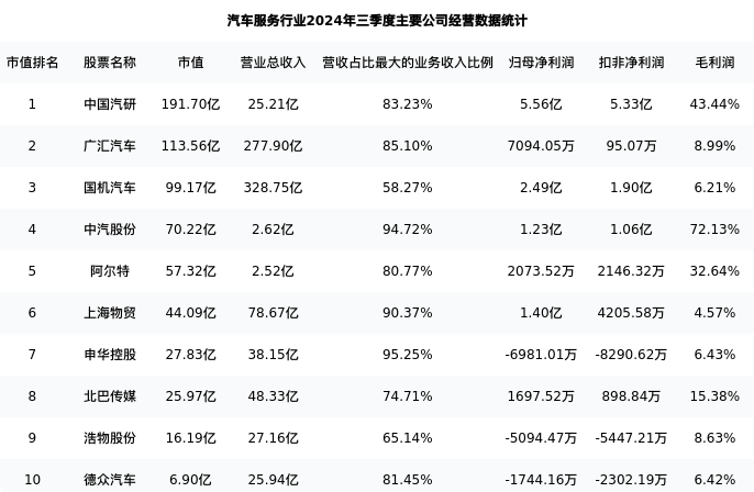中国汽研最新报告期数据为三季度,下表汇总了汽车服务行业内市值靠前的公司三季度主要经营数据