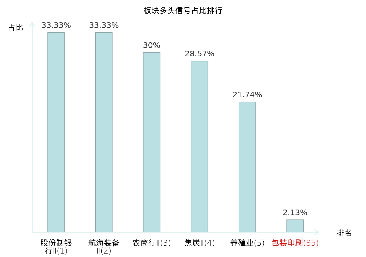 全市场所有行业板块中主力多头信号占比排名中,股份制银行Ⅱ板块位居第一。焦炭Ⅱ板块名次提升最快,较昨日上升119位。