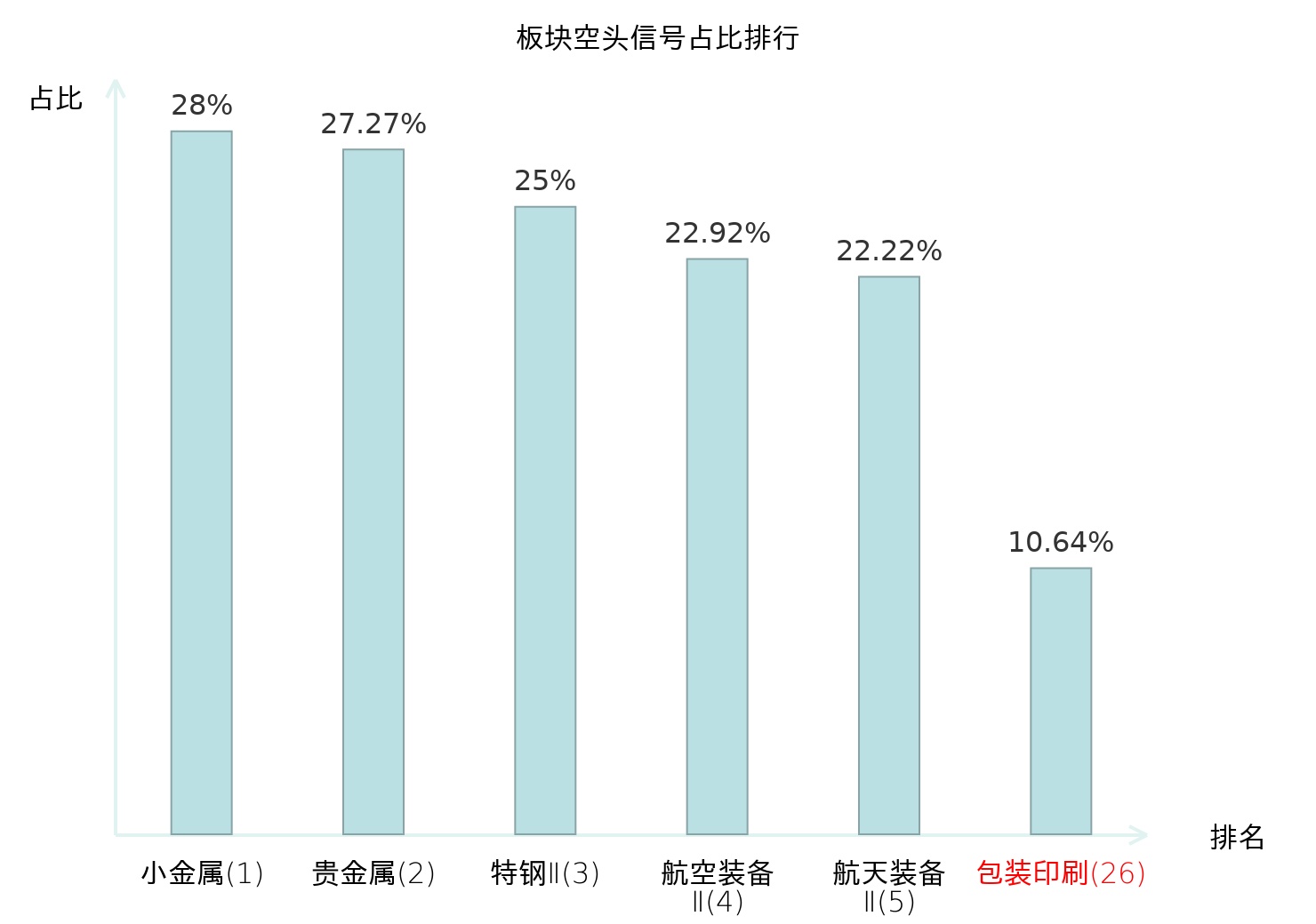 全市场所有行业板块中主力空头信号占比排名中,小金属板块位居第一。铁路公路板块名次提升最快,较昨日上升113位。