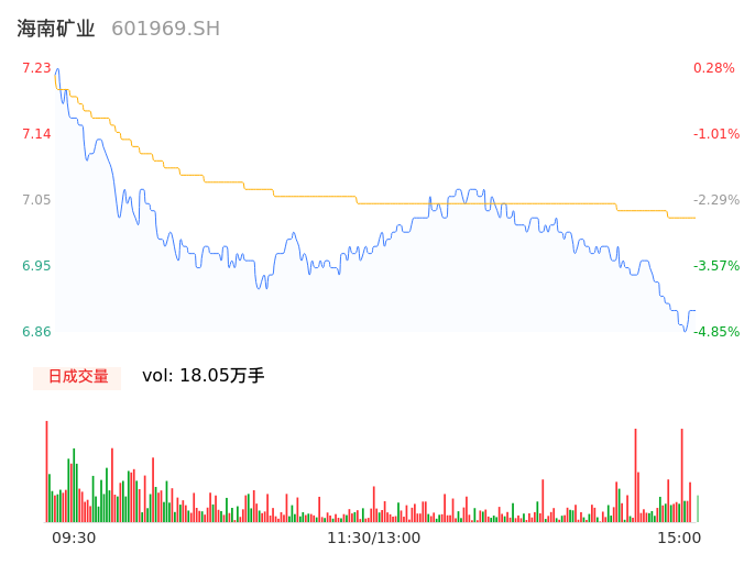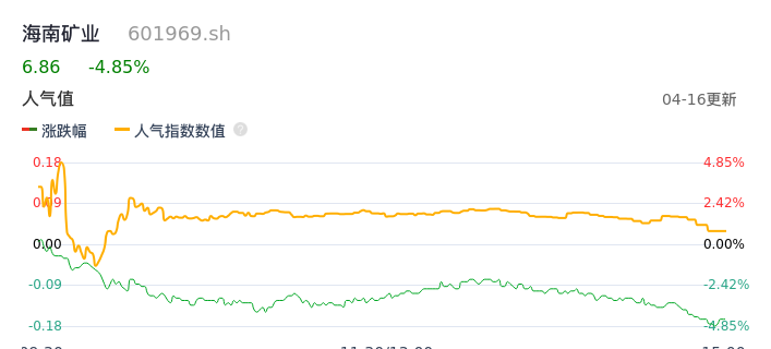 04月16日,海南矿业收报6.86,股价涨幅-4.85%,成交金额1.27亿元,换手率0.89%。