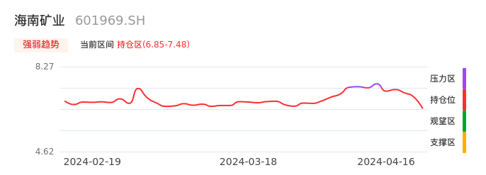 我们来看一下该股的九方特色指标强弱趋势的情况:海南矿业自04月10日从压力区回到持仓区。股价近期持续调整。后续重点关注能否站稳多空分界点:6.85元。如被有效击穿则将进入空头行情。