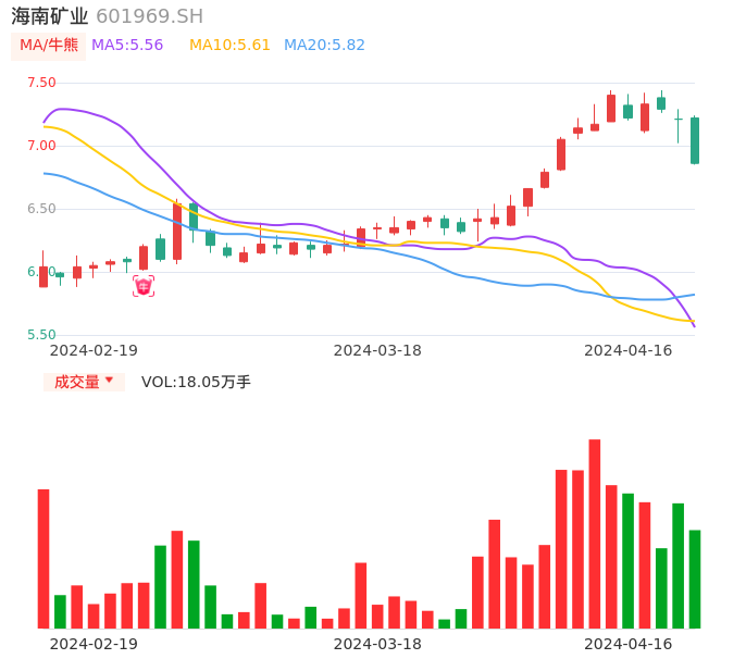 04月16日,海南矿业收报6.86,股价涨幅-4.85%,成交金额1.27亿元,换手率0.89%。