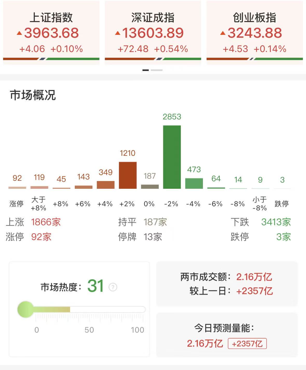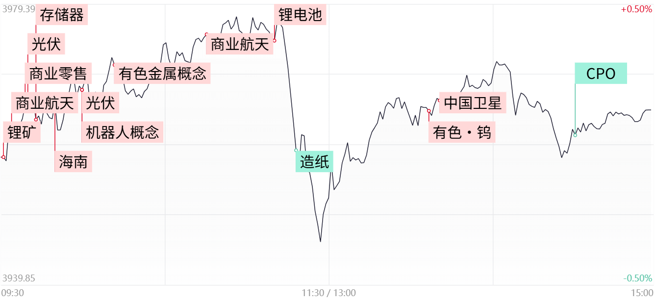 财联社12月26日讯,市场冲高回落,沪指放量微涨0.1%,录得8连阳。沪深两市成交额2.16万亿,较上一个交易日放量2357亿。盘面上,市场热点快速轮动,全市场超3400只个股下跌。从板块来看,商业航天概念再度爆发,神剑股份7连板,中国卫星3连板,通宇通讯等十余股涨停。锂电产业链走强,天际股份4天3板,佛塑科技、丰元股份、永兴材料涨停。海南自贸概念反复活跃,海南发展6天5板,洲际油气、京粮控股涨停。下跌方面,造纸、白酒、算力硬件等板块跌幅居前。其中算力硬件概念表现较弱,长光华芯跌超11%。截至收盘,沪指涨0.1%,深成指涨0.54%,创业板指0.14%。