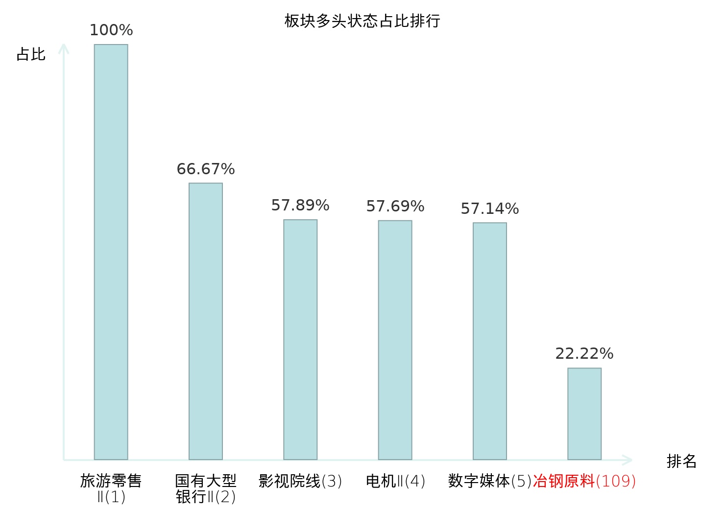 全市场所有行业板块中主力多头状态占比排名中,旅游零售Ⅱ板块位居第一。专业连锁Ⅱ板块名次提升最快,较昨日上升56位。