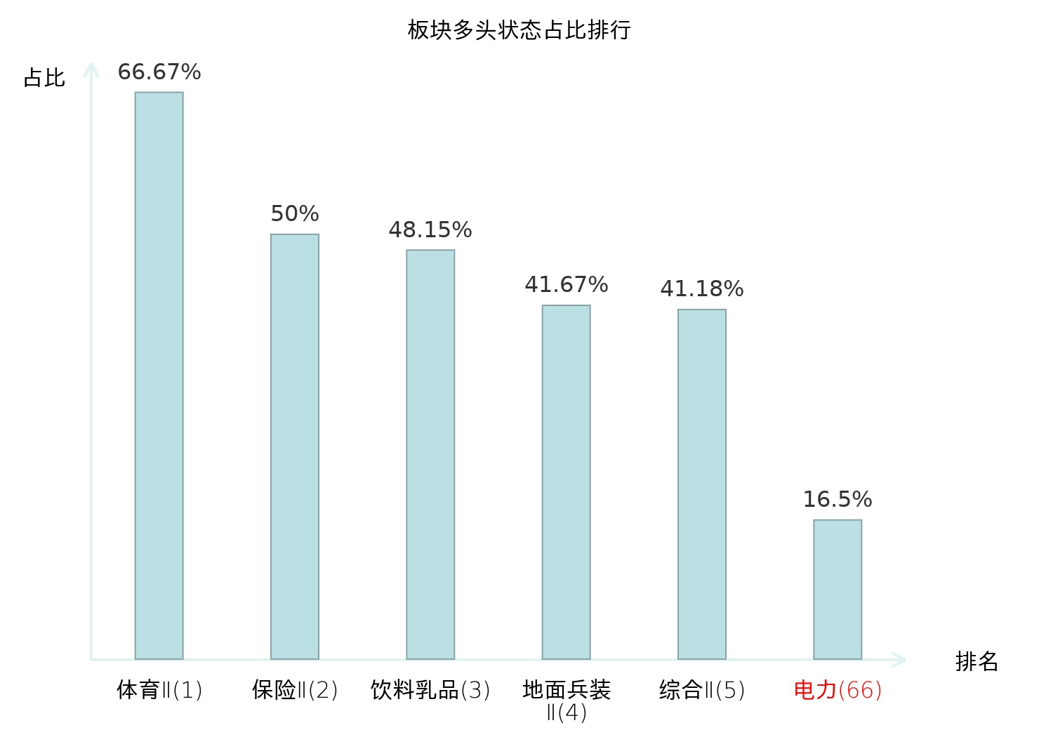 全市场所有行业板块中主力多头状态占比排名中,体育Ⅱ板块位居第一。种植业板块名次提升最快,较昨日上升70位。