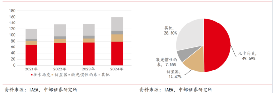 图表5:2021-2024年全球聚变装置数量(个)及结构(左)截至2024年全球聚变装置按技术路线分(右)