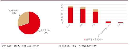 图表6:2024年聚变项目的资金来源(左)截至2024年全球各地区的聚变装置(按实验堆和电站分)(单位:个)(右)