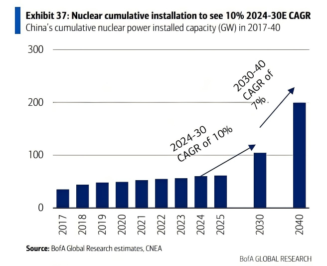 报告预测,中国核电装机容量将从2025年的60GW增长到2030年的100GW,占全球在建核电容量的60%。