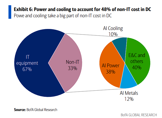 在这一背景下,美银预计到2030年,中国AI总投资将达到约2-2.5万亿元,而重点关注的8000亿元非IT基础设施投资中,电力系统(发电和输电)将占据38%的绝对主导地位,其次是数据中心建设所需金属(12%)和先进冷却系统(10%)。