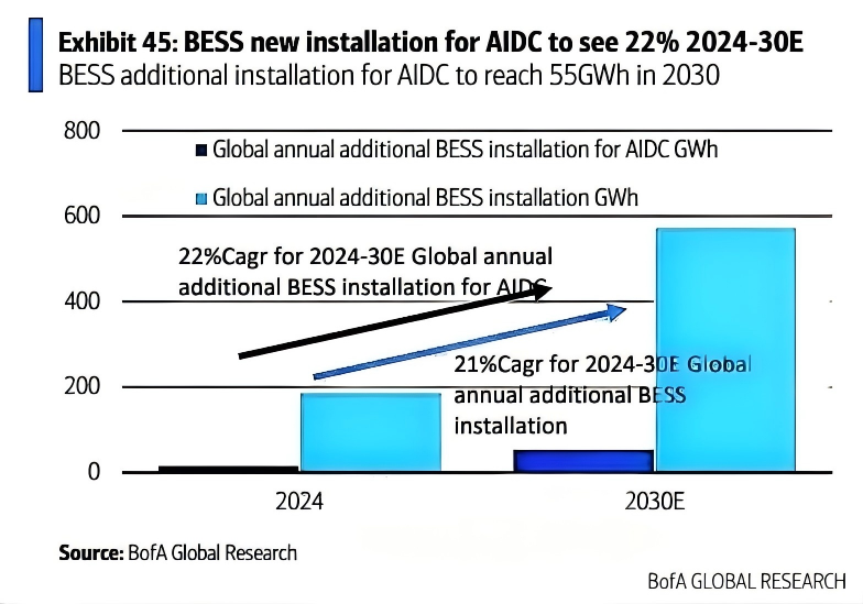 美银预计,到2030年,与AIDC相关的电池储能系统(BESS)新增装机量将达到55GWh,2024-2030年复合增长率高达22%。