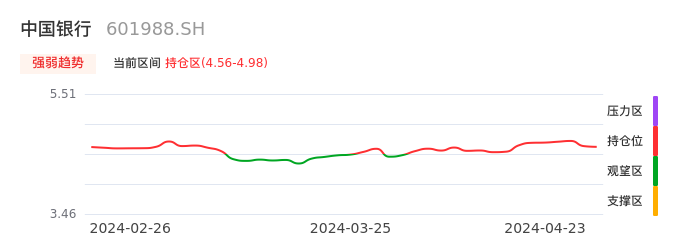 我们来看一下该股的九方特色指标强弱趋势的情况:中国银行自04月01日从观望区上穿到持仓区。股价近期在多头区域持续强势上扬,上升动能仍较为充足,可积极关注。后续重点关注上方压力位:4.98元是否能突破上攻。