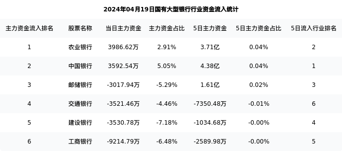中国银行今日净流入3592.54万元,主力占比5.05%,在行业内排名:2/6;5日净流入4.38亿元,主力占比0.04%,在行业内排名:1/6。
