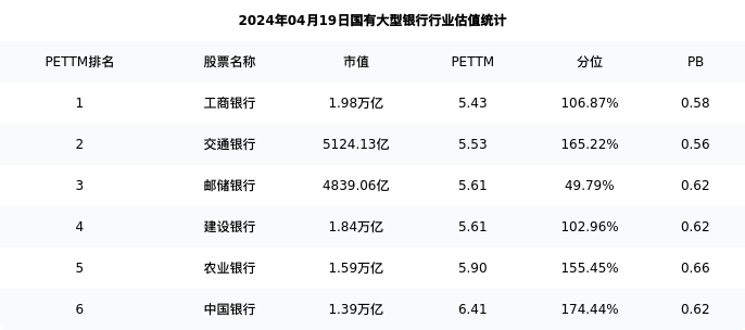 从估值角度看:中国银行最新市盈率PETTM为6.41,在行业内排名6/6,处于174.44分位。