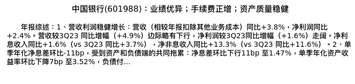值得注意的是:2024年04月中泰证券的戴志锋/邓美君/杨超伦分析师,首次发布关于中国银行的研究报告,标题为:中国银行(601988):业绩优异;手续费正增;资产质量稳健。
