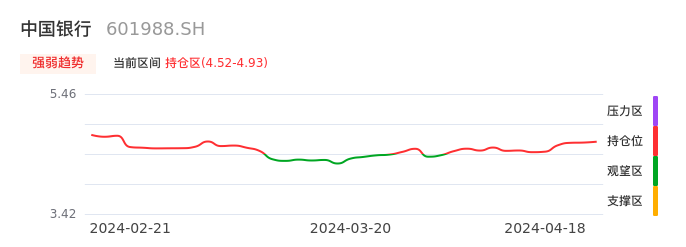 我们来看一下该股的九方特色指标强弱趋势的情况:中国银行自04月01日从观望区上穿到持仓区。股价近期在多头区域持续强势上扬,上升动能仍较为充足,可积极关注。后续重点关注上方压力位:4.93元是否能突破上攻。