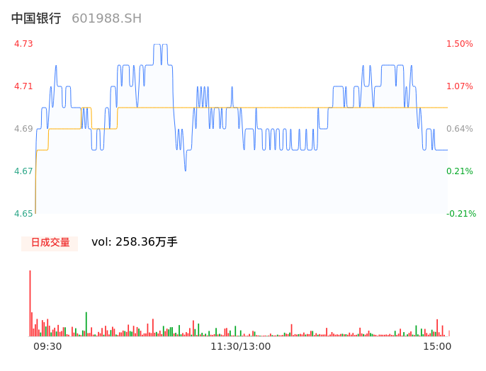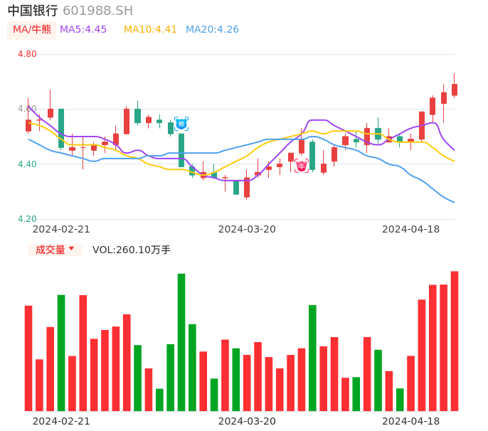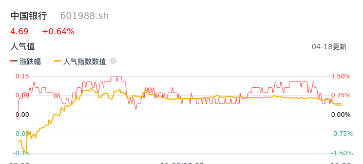 04月18日,中国银行收报4.69,股价涨幅0.64%,成交金额12.22亿元,换手率0.12%。