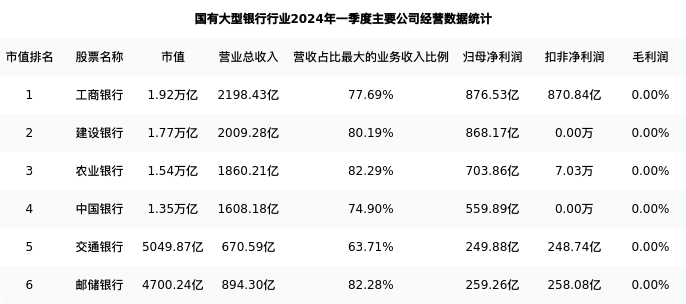 中国银行最新报告期数据为一季度,下表汇总了国有大型银行行业内市值靠前的公司一季度主要经营数据