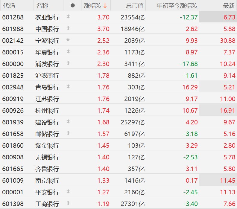 A股银行股集体上涨,农业银行、中国银行涨超3%