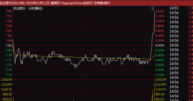 银行股在收盘集合竞价阶段出现异动走势,板块指数放量直线拉升翻红。农业银行临近收盘垂直拉升由绿转红,中国银行、工商银行、交通银行、邮储银行等尾盘就出现放量抢筹现象,并均以全天最高价报收。