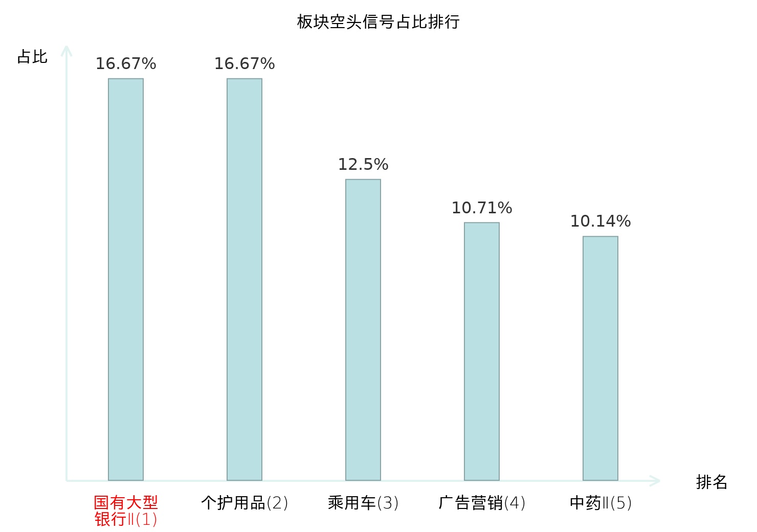 全市场所有行业板块中主力空头信号占比排名中,国有大型银行Ⅱ板块位居第一。医疗服务板块名次提升最快,较昨日上升110位。