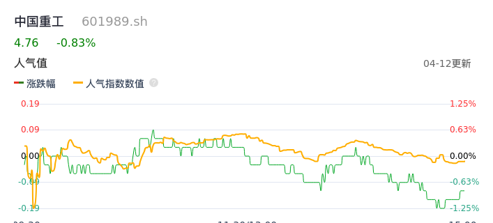 04月12日,中国重工收报4.76,股价涨幅-0.83%,成交金额4.34亿元,换手率0.41%。