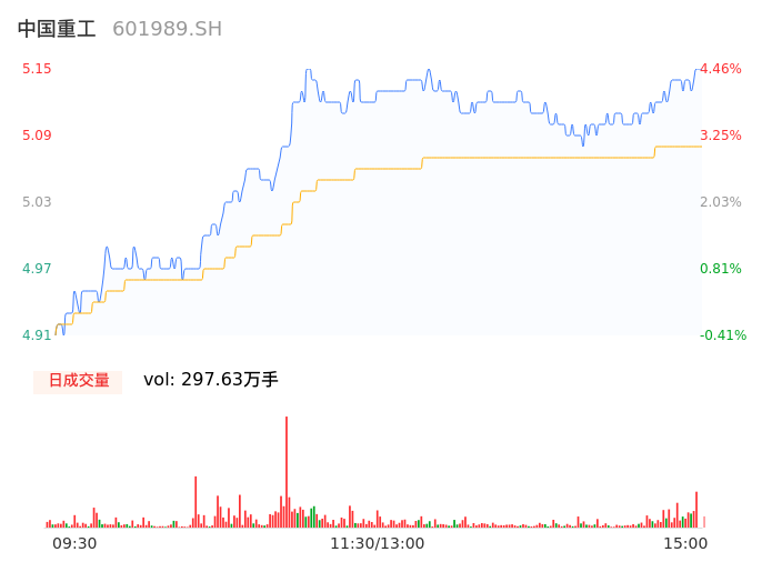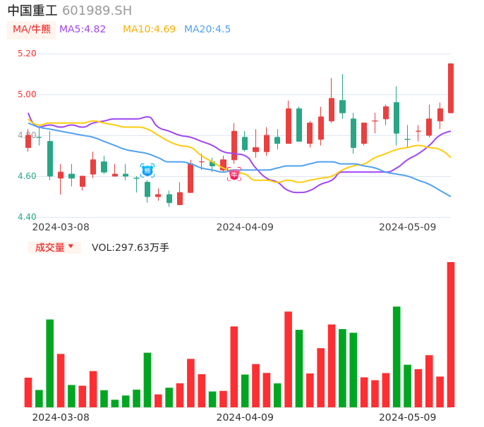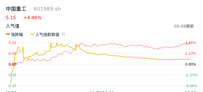 05月09日,中国重工收报5.15,股价涨幅4.46%,成交金额15.13亿元,换手率1.35%。
