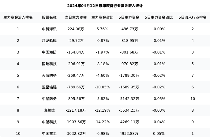 中国重工今日净流出3032.82万元,主力占比6.98%,在行业内排名:10/11;5日净流入4933.88万元,主力占比0.05%,在行业内排名:1/11。