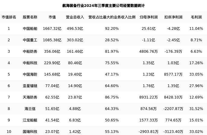 中国重工最新报告期数据为三季度,下表汇总了航海装备行业内市值靠前的公司三季度主要经营数据