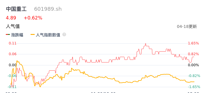04月18日,中国重工收报4.89,股价涨幅0.62%,成交金额7.32亿元,换手率0.68%。