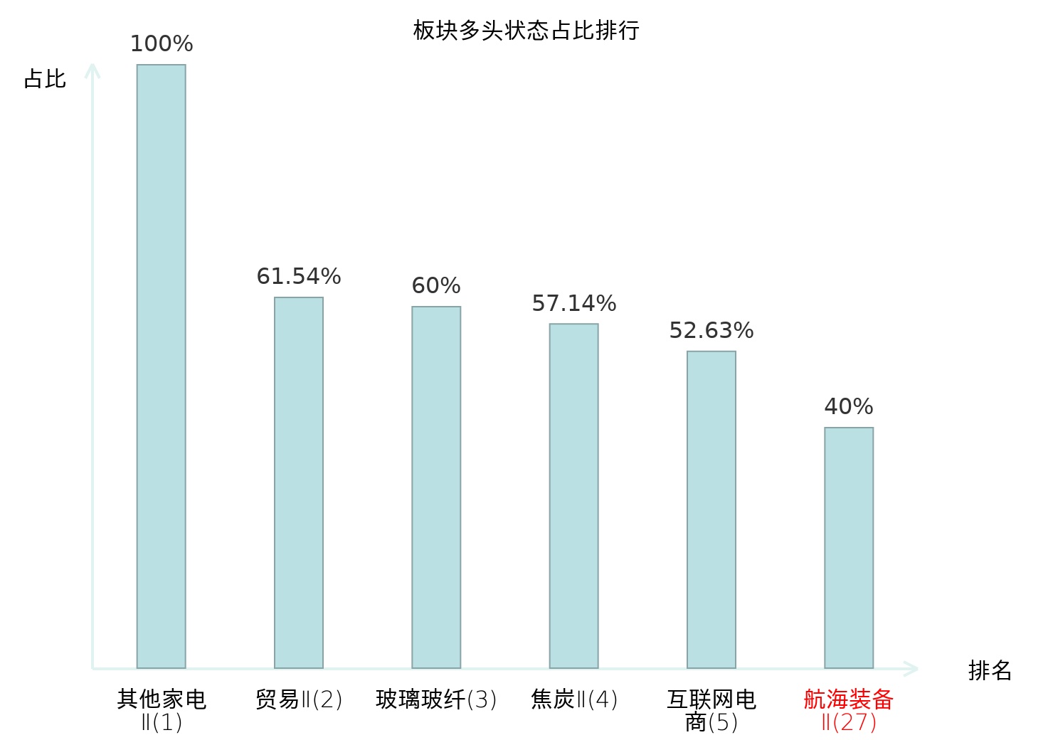全市场所有行业板块中主力多头状态占比排名中,其他家电Ⅱ板块位居第一。教育板块名次提升最快,较昨日上升50位。