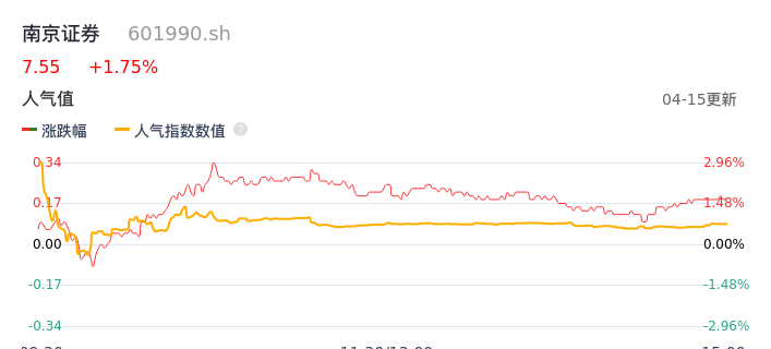04月15日,南京证券收报7.55,股价涨幅1.75%,成交金额1.36亿元,换手率0.50%。