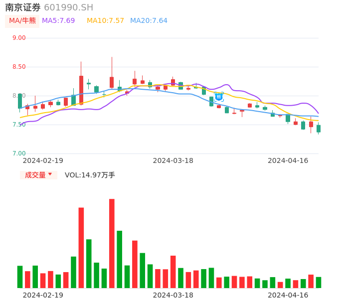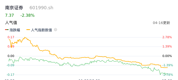 04月16日,南京证券收报7.37,股价涨幅-2.38%,成交金额1.12亿元,换手率0.41%。
