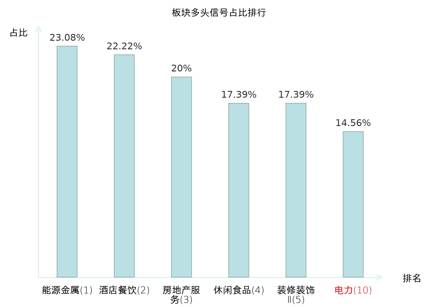 全市场所有行业板块中主力多头信号占比排名中,能源金属板块位居第一。渔业板块名次提升最快,较昨日上升116位。