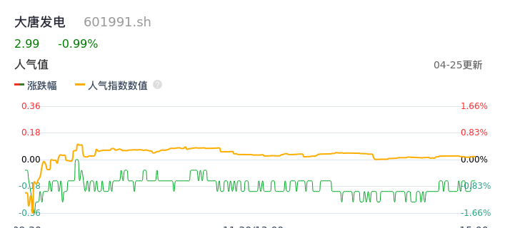 04月25日,大唐发电收报2.99,股价涨幅-0.99%,成交金额1.79亿元,换手率0.48%。