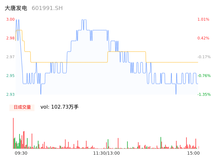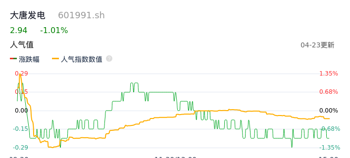 04月23日,大唐发电收报2.94,股价涨幅-1.01%,成交金额3.04亿元,换手率0.83%。