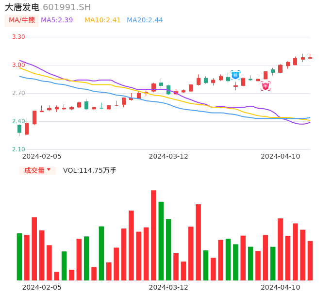 值得注意的是:2024年04月天风证券的郭丽丽分析师,首次发布关于大唐发电的研究报告,标题为:大唐发电(601991):煤电盈利大幅改善 清洁能源转型有望加速。