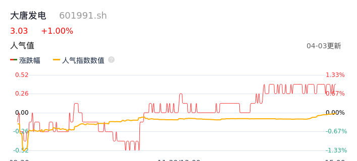 04月03日,大唐发电收报3.03,股价涨幅1.00%,成交金额3.66亿元,换手率0.98%。