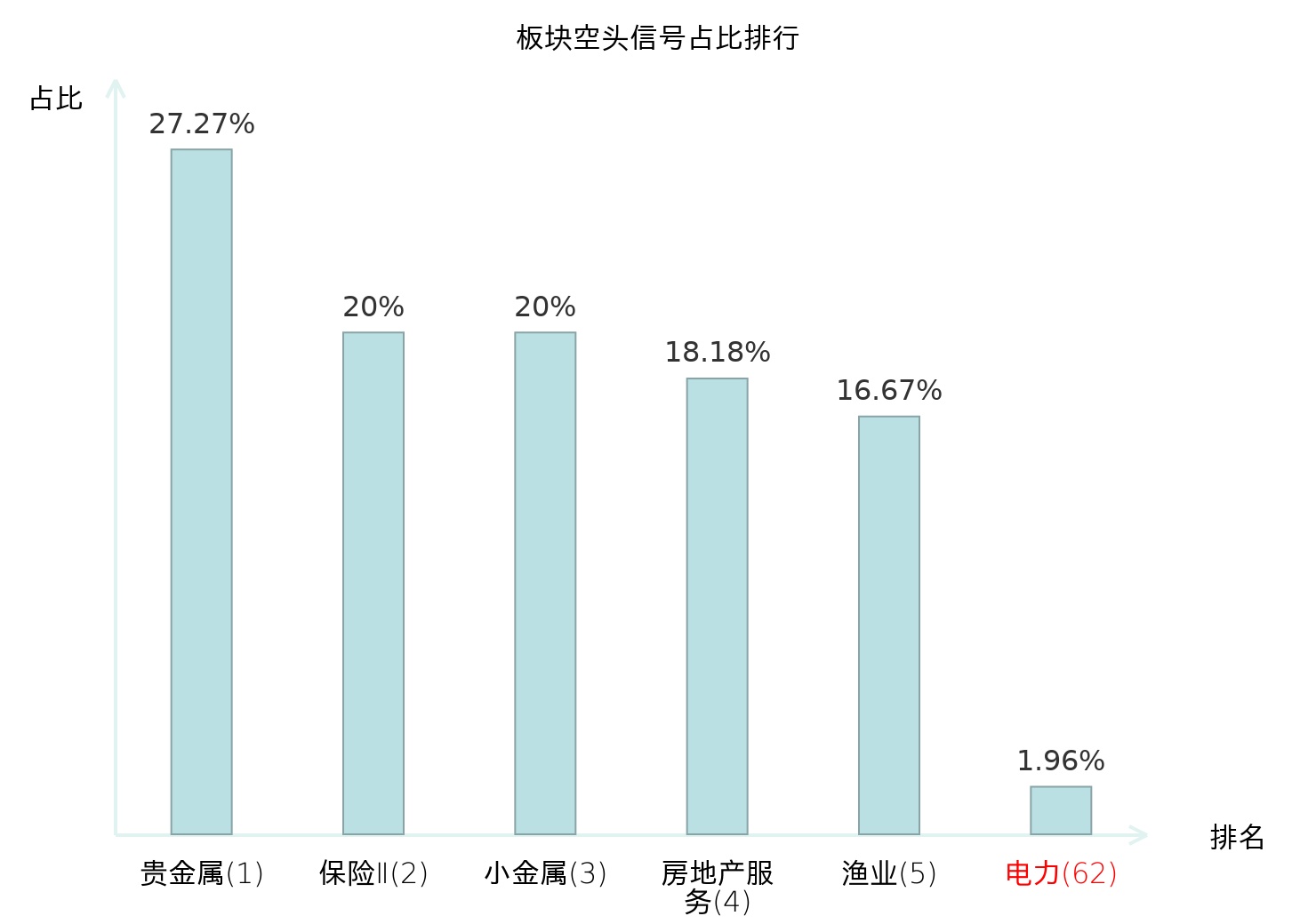 全市场所有行业板块中主力空头信号占比排名中,贵金属板块位居第一。小金属板块名次提升最快,较昨日上升117位。