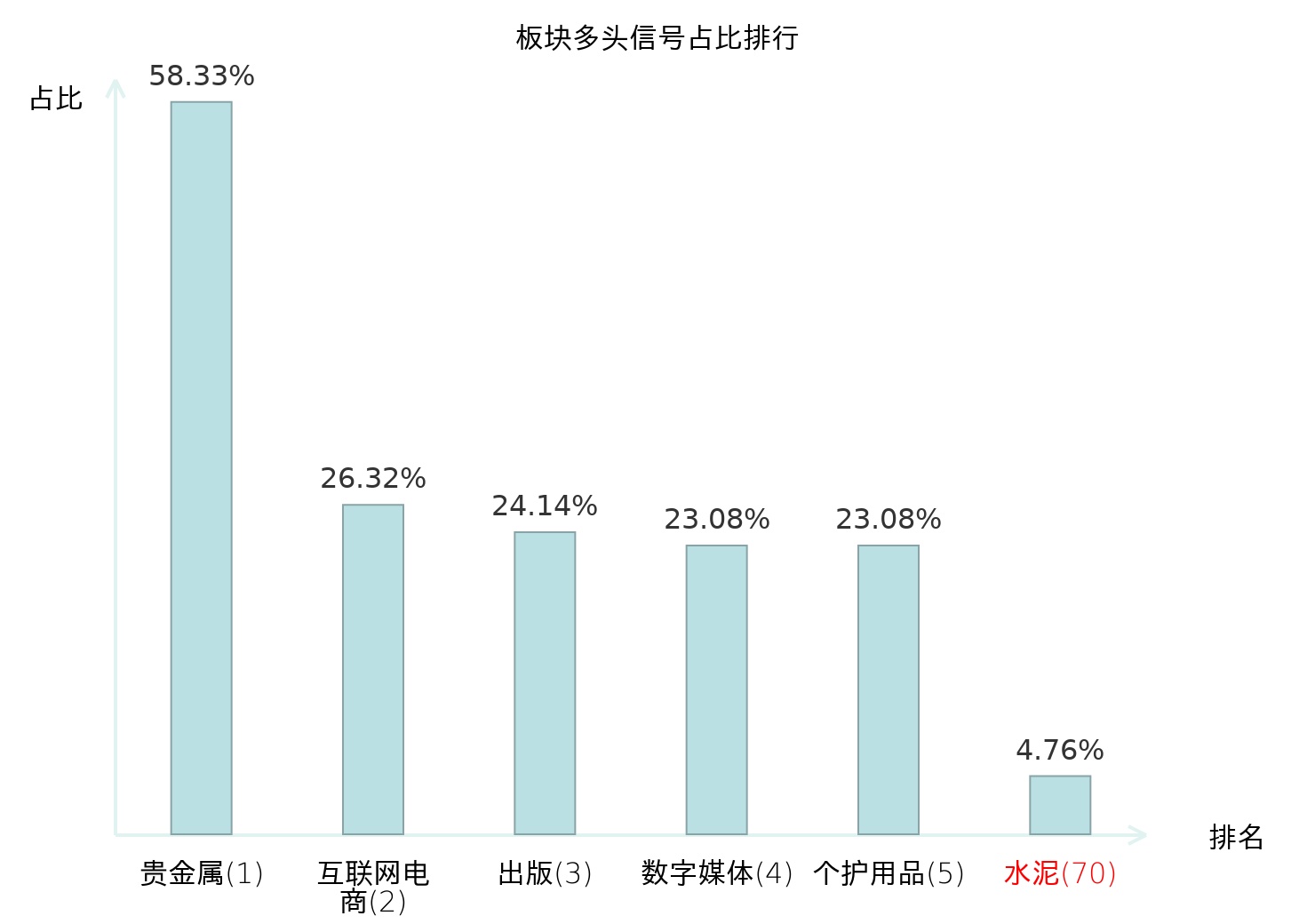 全市场所有行业板块中主力多头信号占比排名中,贵金属板块位居第一。贵金属板块名次提升最快,较昨日上升108位。