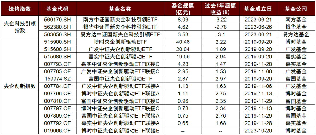 成分股方面,Wind统计显示,央企科技引领指数权重较高的前5家企业分别为海康威视、中航光电、中航沈飞、振华科技、宝信软件(具体标的请参见图表1)。央企创新指数权重较高的前5家企业分别为长安汽车、国电南瑞、海康威视、中国石油、中航光电(权重较高的标的参见图表2)。从跟踪指数的基金来看,目前挂钩央企科技引领指数的基金产品共有3只,分别为南方中证国新央企科技引领ETF、银华中证国新央企科技引领ETF、易方达中证国新央企科技引领ETF,三只ETF均成立于2023年6月,截至2023年12月1日,其基金规模分别为8.1亿元、4.6亿元、3.5亿元。央企创新指数挂钩的基金产品共有13只,跟踪产品及规模参见图表3。