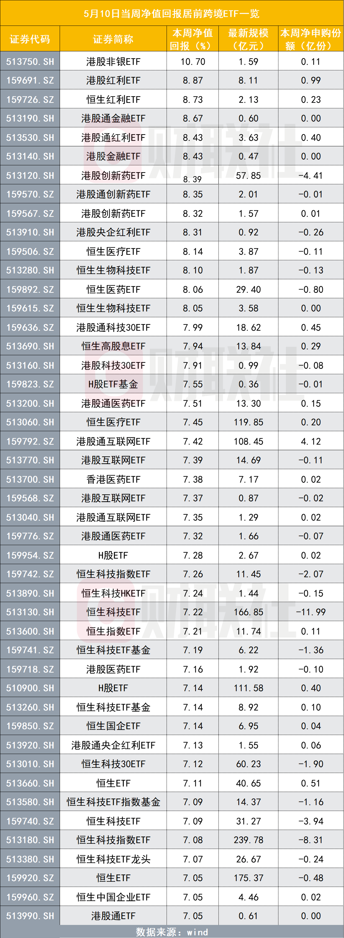 Wind数据显示,12只港股主题ETF5月10日净值创成立以来新高,港股红利主题产品占半数。港股通50、国企、消费、医疗等香港市场不同细分主题的ETF也出现上涨。本周净值回报排名前80只跨境ETF均为港股主题产品。