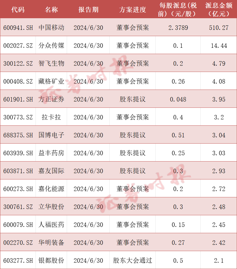 此外,智飞生物、藏格矿业、方正证券等不少公司半年度分红不低于3亿元,立华股份、人福医药、银都股份等中报分红金额超过2亿元。