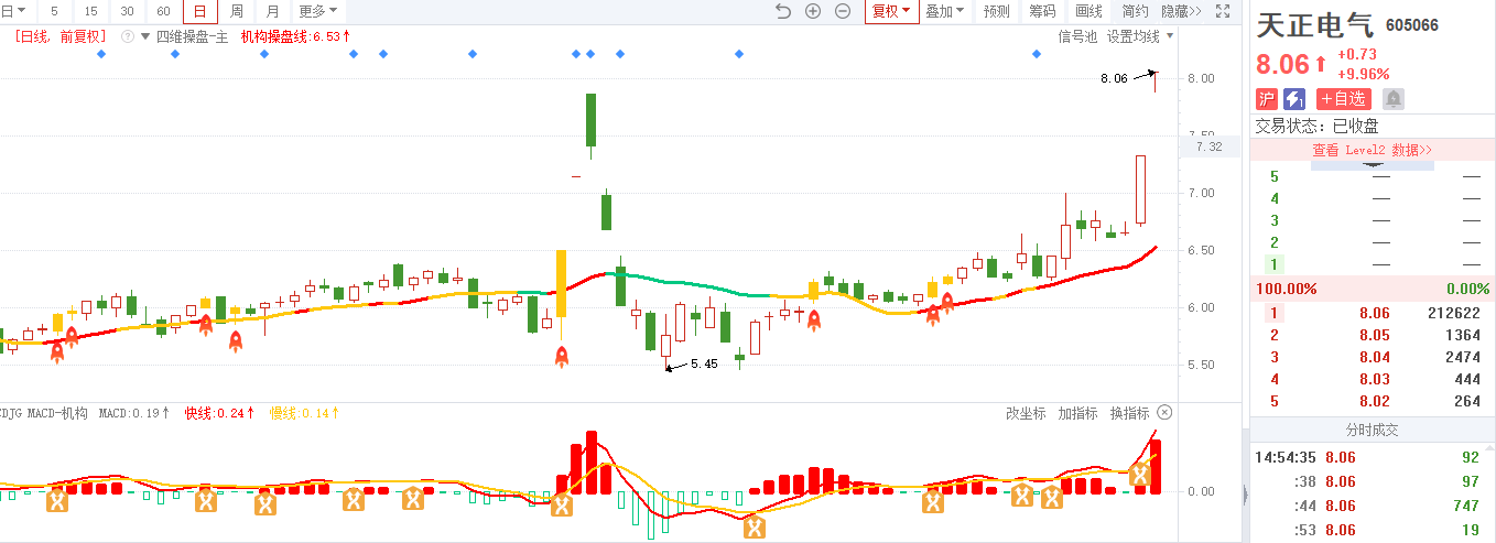 3)天正电气-四维操盘-近期出现火箭信号且底部量柱由绿转红