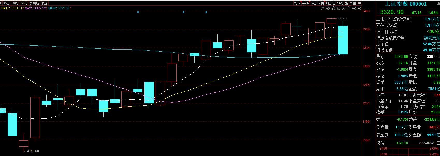 沪指跌1.98%,深证成指跌2.89%,创业板指跌3.82%。两市个股普跌,下跌个股超4700只,红盘个股不足600只;两市全天成交1.87万亿元,较上一日缩量成交1376亿元,内资主力资金净卖出1306亿元;两市涨跌中位数为-2.88%。