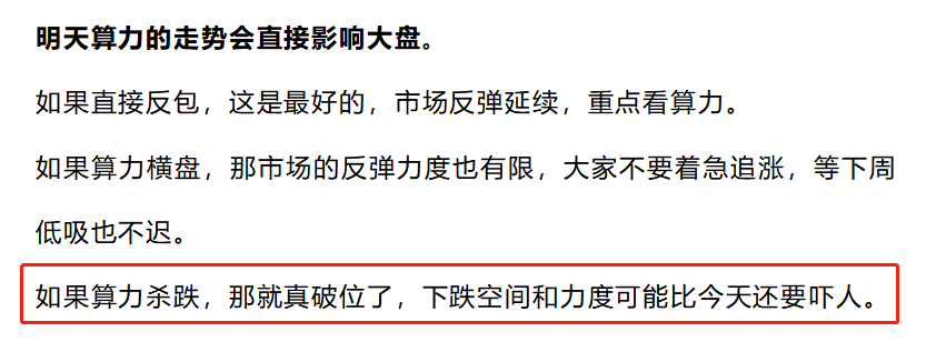 昨天说算力板块的走势会直接影响今天的大盘,因为昨天市场反抽,指数上去了,但是算力没有动静,一旦再跌就真破位了。今天算力是低开破位,资金一看市场的核心板块不行了,都在慌张出逃。