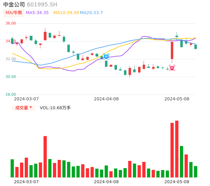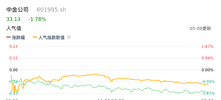 05月08日,中金公司收报33.13,股价涨幅-1.78%,成交金额3.55亿元,换手率0.37%。
