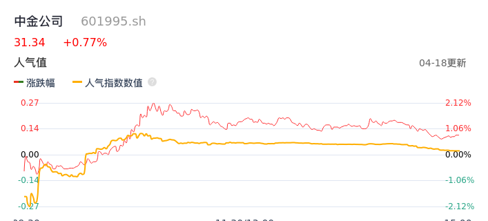 04月18日,中金公司收报31.34,股价涨幅0.77%,成交金额4.59亿元,换手率0.50%。